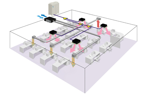 Daikin VRV outdoor units can be easily located on the roof avoiding the need for a plant room and providing more usable space for occupancy. VRV is quicker and easier to install and requires less plumbing and wiring than water-based chiller systems. Because installation can be carried out one floor at a time, new buildings can be occupied quicker and there is minimum disruption when VRV is retro-fitted in existing buildings.